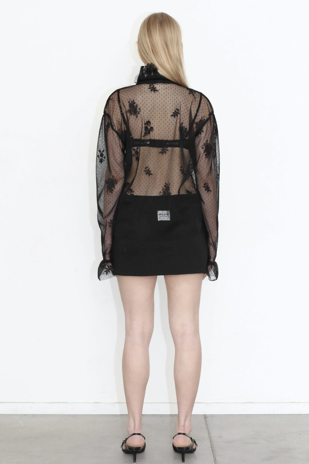 Camisa de encaje, cuello alto con pliegues en las mangas igual. En el frente posee tiras para regular la prenda segun tu gusto y medida.